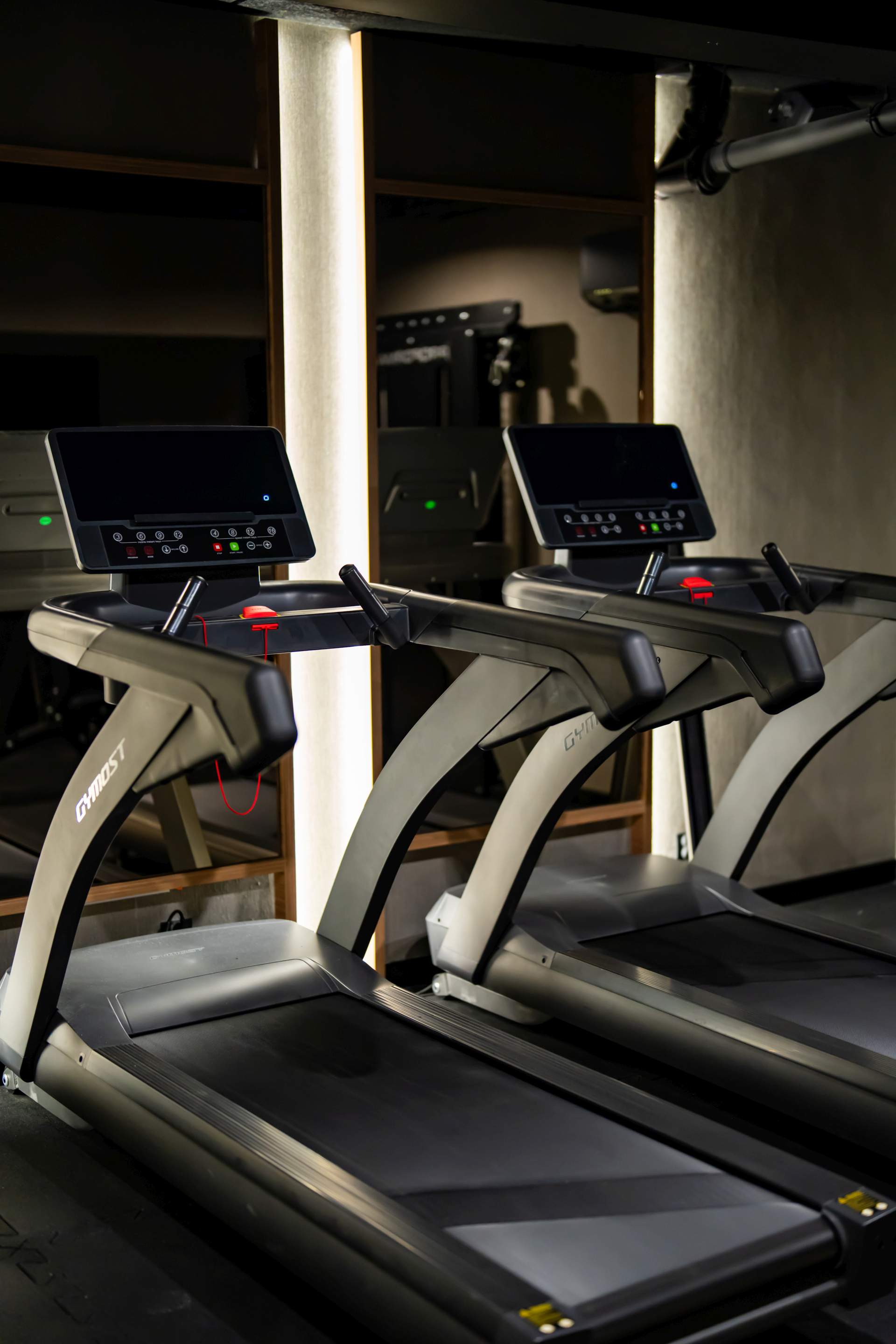 vstup do moderní posilovny vybavené kardio stroji a zónou s činkami
