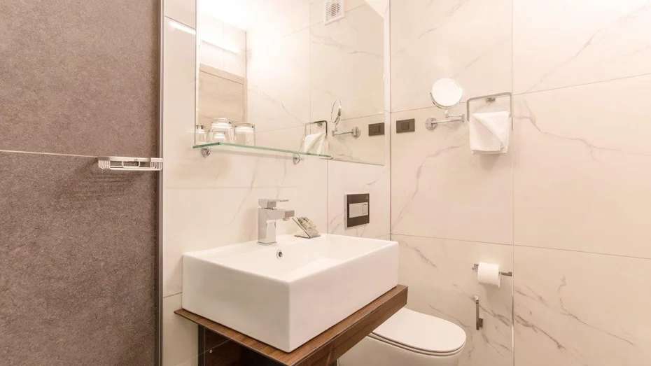 vybaven satelitní TV, telefonem, minibarem a trezorem. Má vlastní koupelnu se