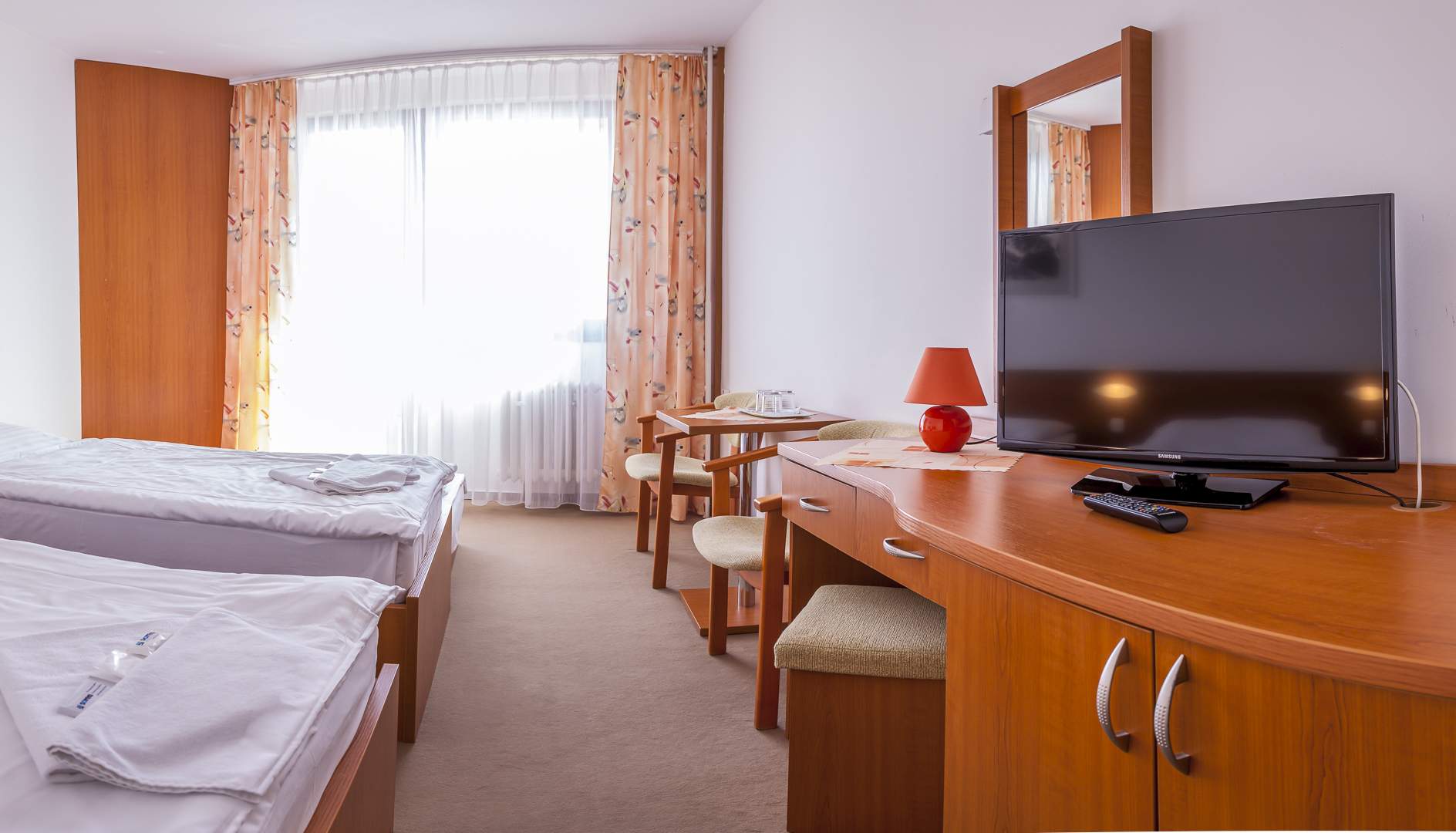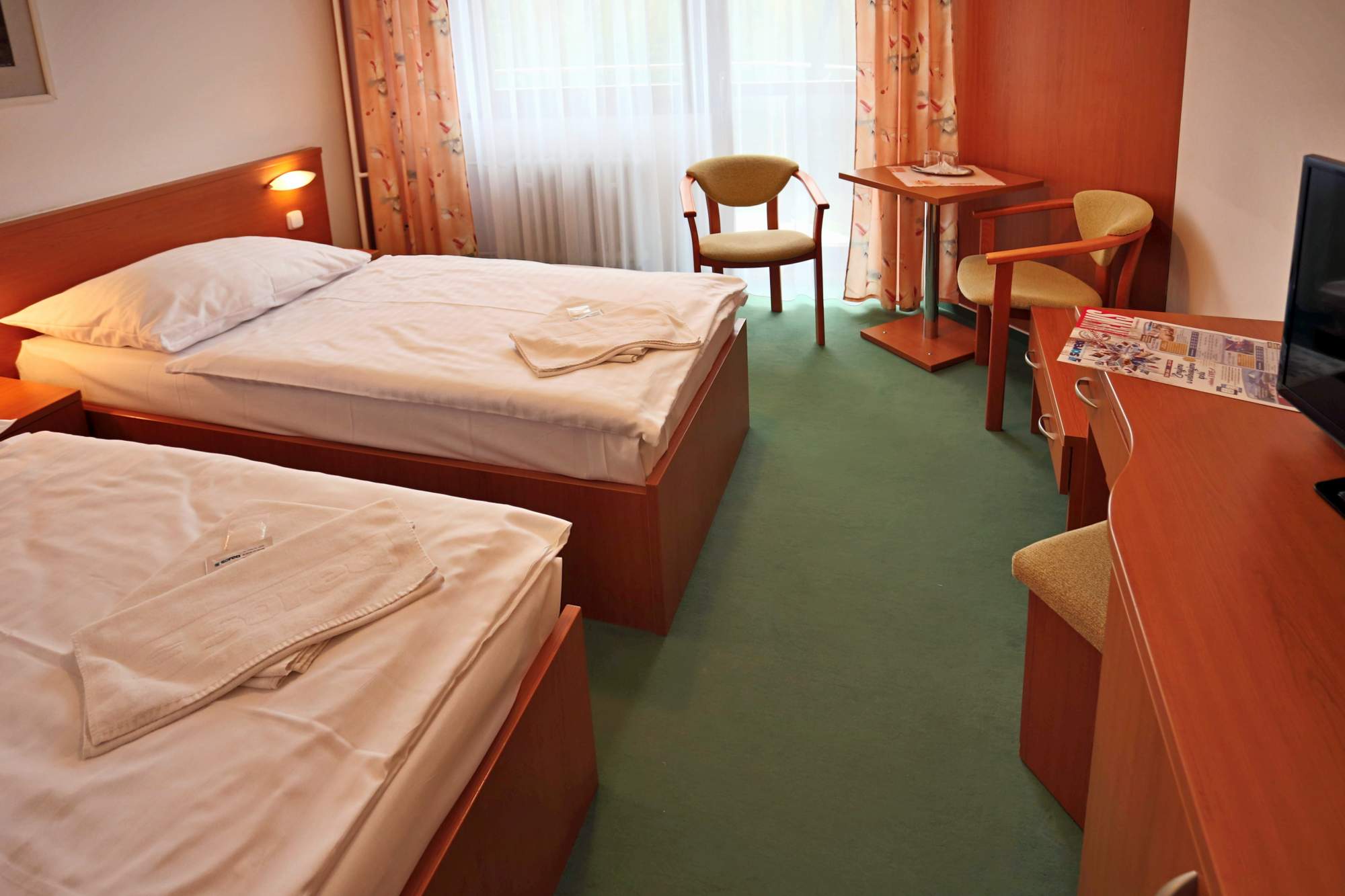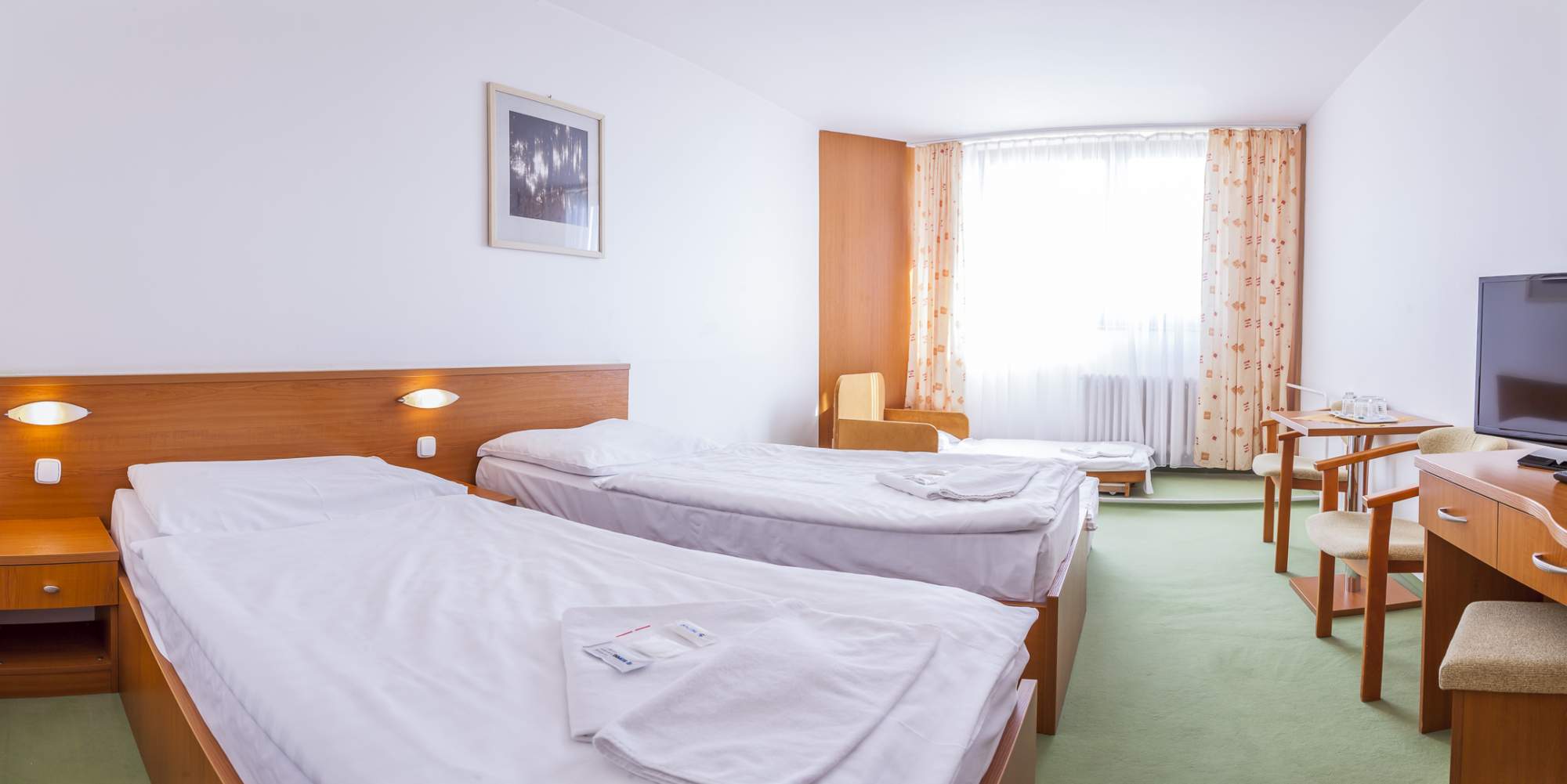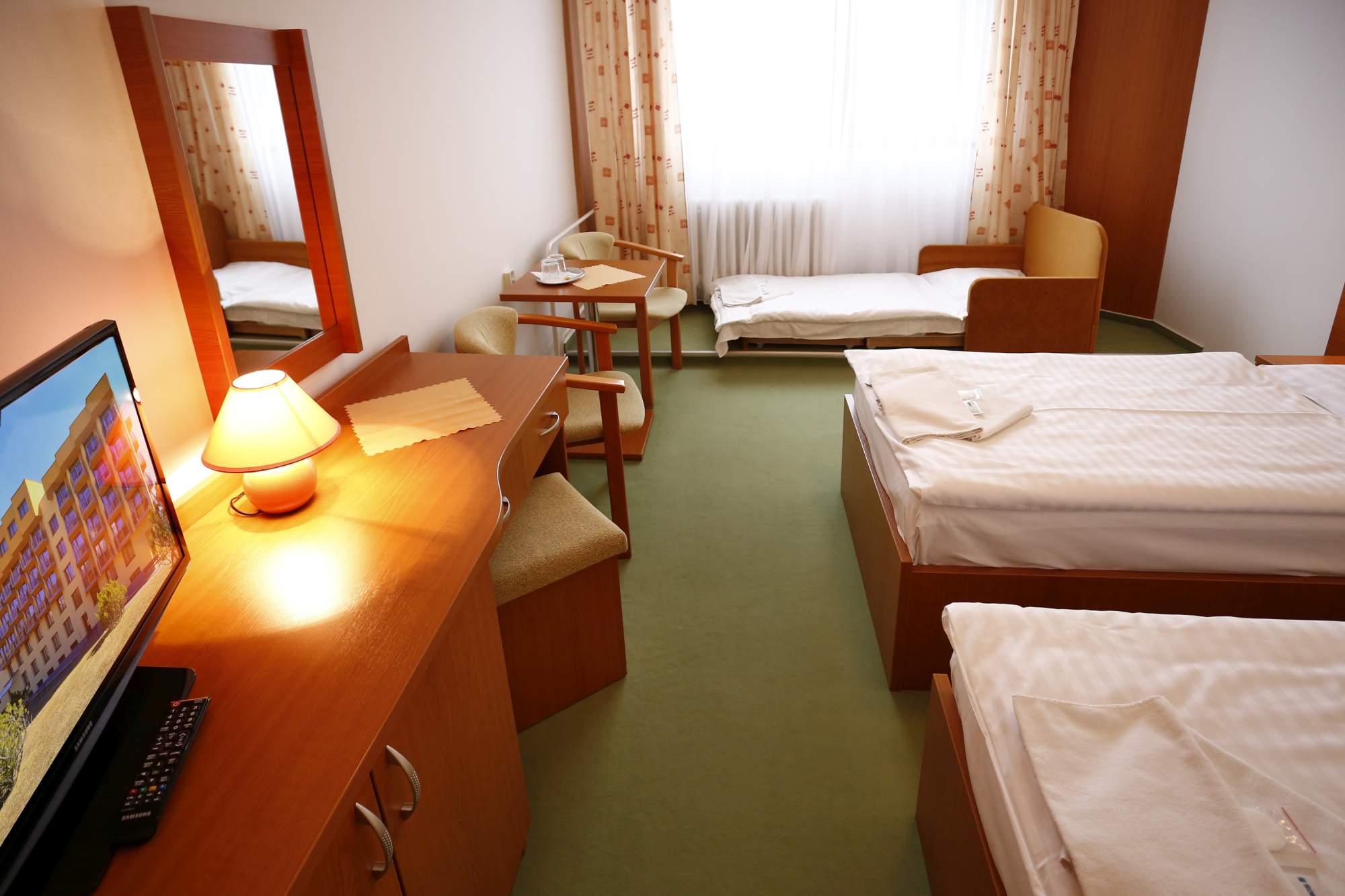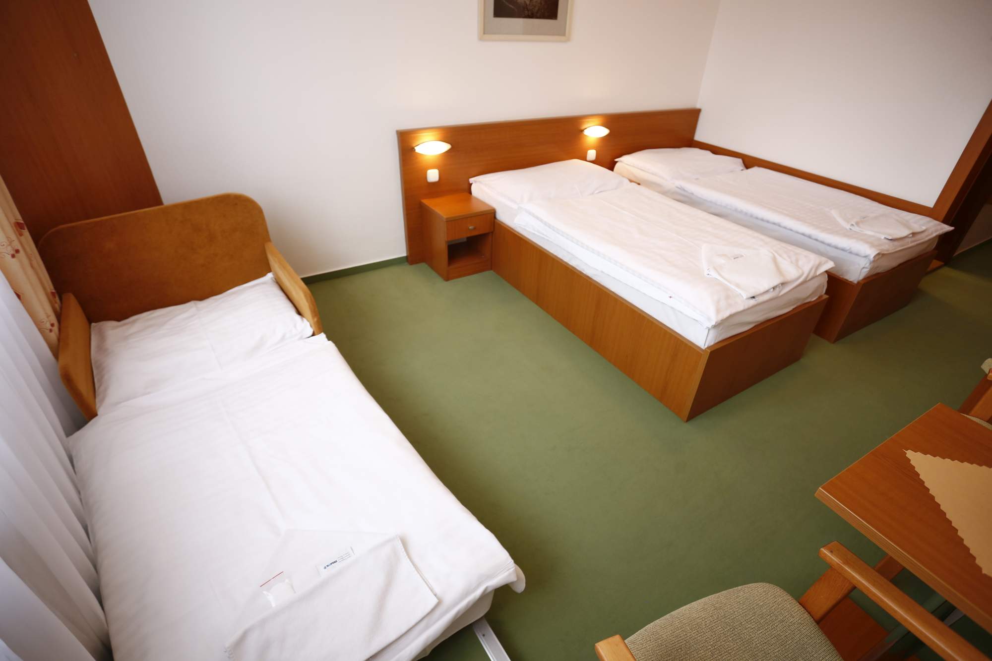Ve dvoulůžkových rekonstruovaných komfortních pokojích s možnosti přistýlky, s vlastním sociálním zařízením, telefonem, TV/SAT a balkónem.