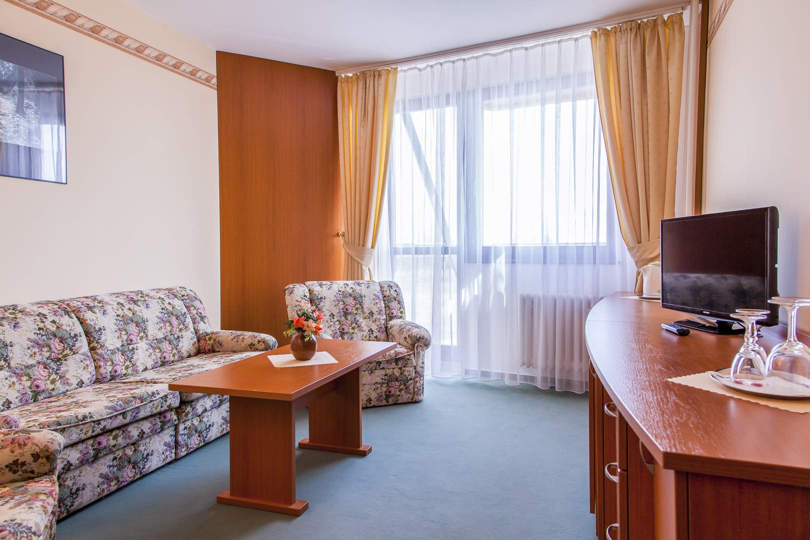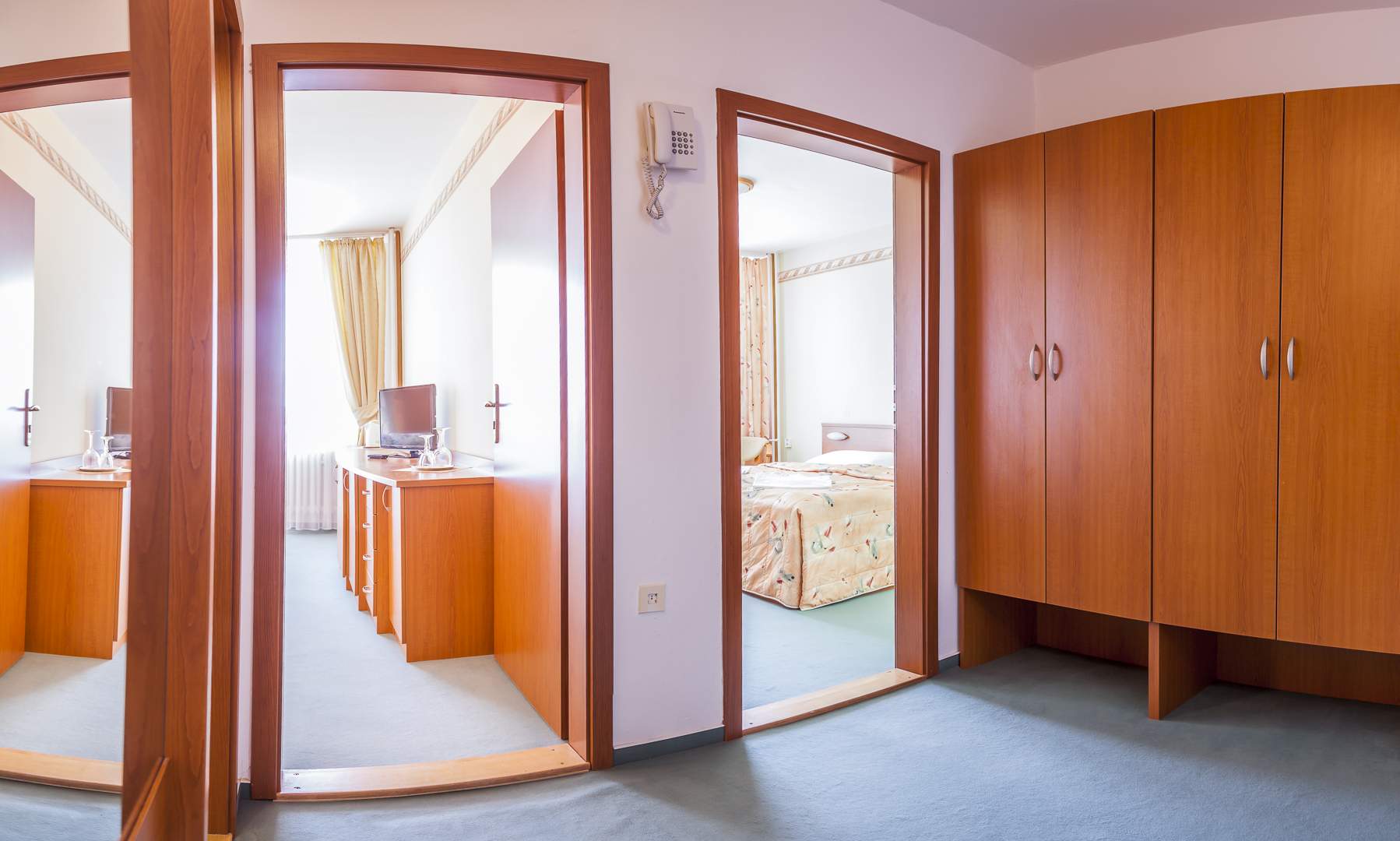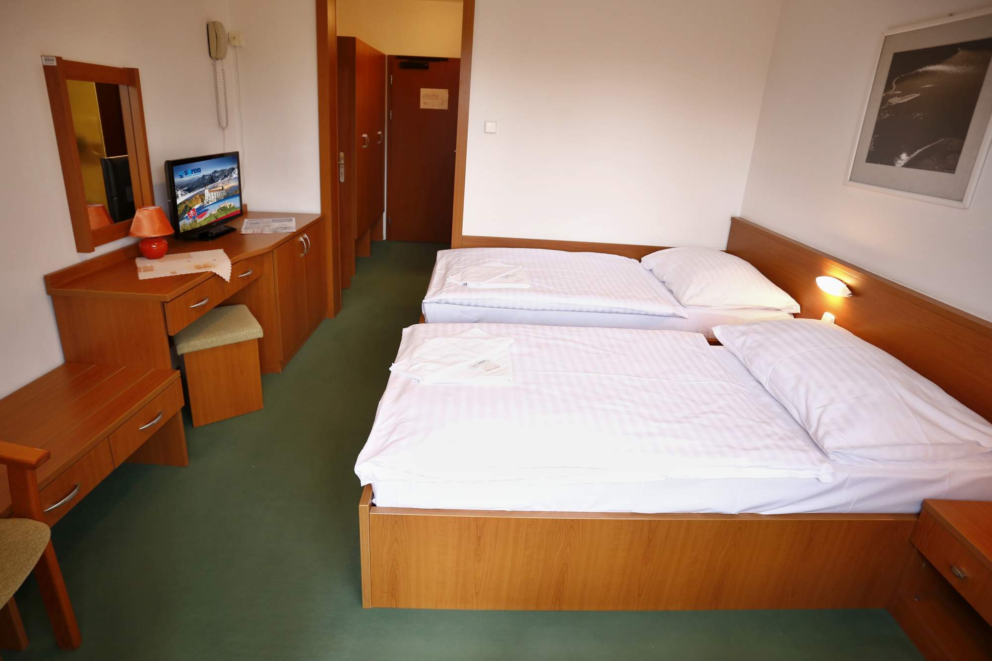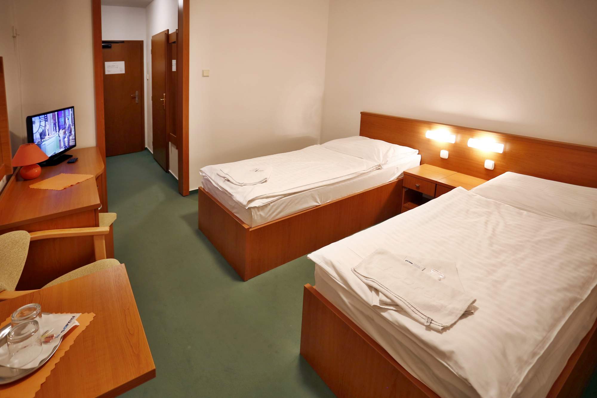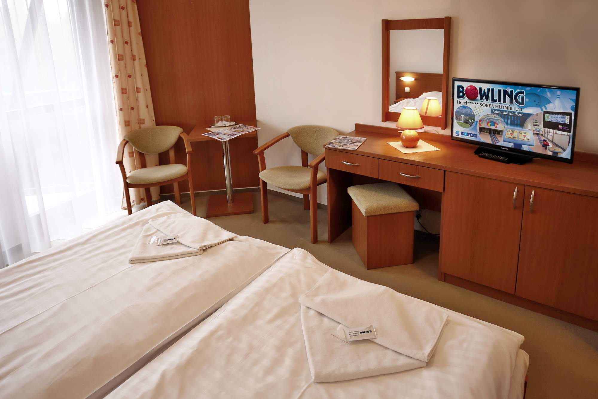 Ve dvoulůžkových rekonstruovaných komfortních pokojích s možnosti přistýlky, s vlastním sociálním zařízením, telefonem, TV/SAT a balkónem.